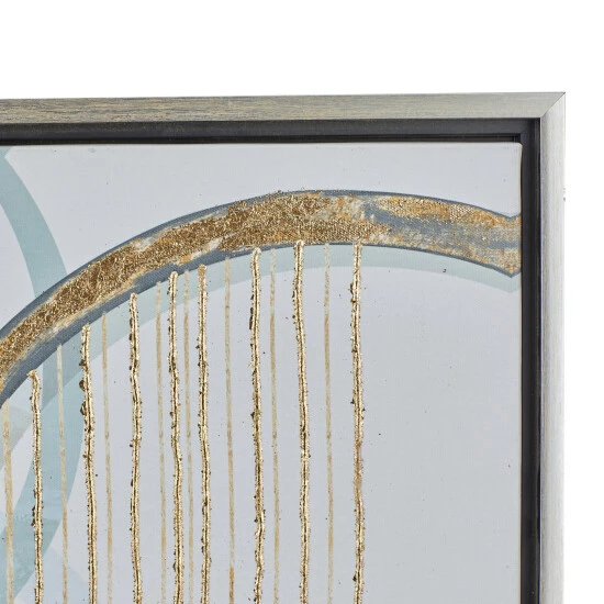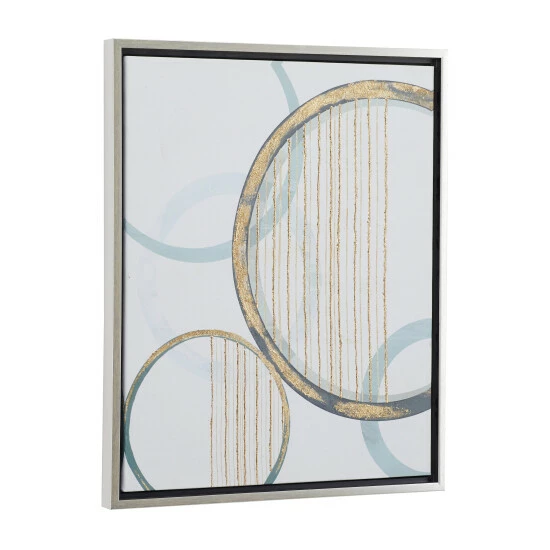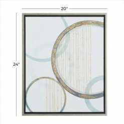 Give your home spaces a dazzling exhibit with this framed canvas wall art decor displayed on your living room or bedroom walls. This wall art exude natural beauty and sophistication in both color and composition. Showcase your personality and turn your walls into an art gallery with this impression wall art. This item comes shipped in one carton. Canvas painting is firmly encased in sturdy resin frame. Easy to hang with 2 back sawtooth hooks. Suitable for indoor use only. Contemporary design.. A contemporary style offers neutral elements and basics form with a bold design. This home decor is crafted with resin and canvas for a solid and durable form. This canvas wall art highlights gold accent details over muted gray, white and faint blue shadows. Ring silhouettes and shadows dominate this wall art and accented with glittered gold details for a splash of glamour and shimmer. This item measures 20″L x 1″W x 24″H and weighs 2 lbs