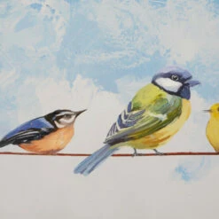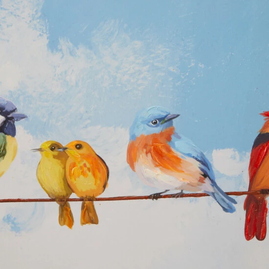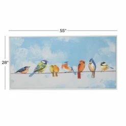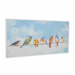 - Eclectic wall decor highlighting a white rectangular frame with an eye-catching painting of different colorful birds sitting on a cable and a blue sky background