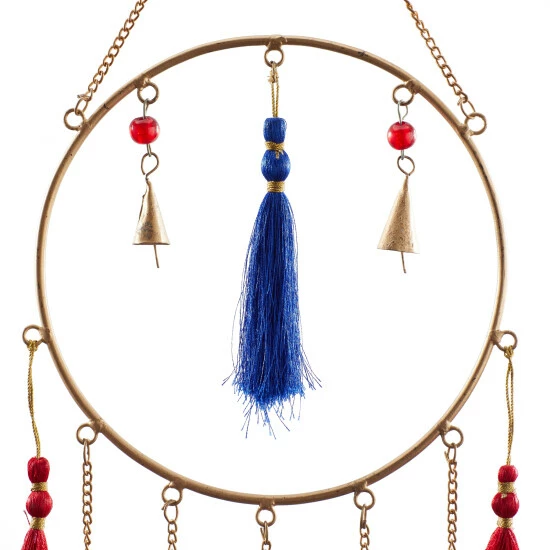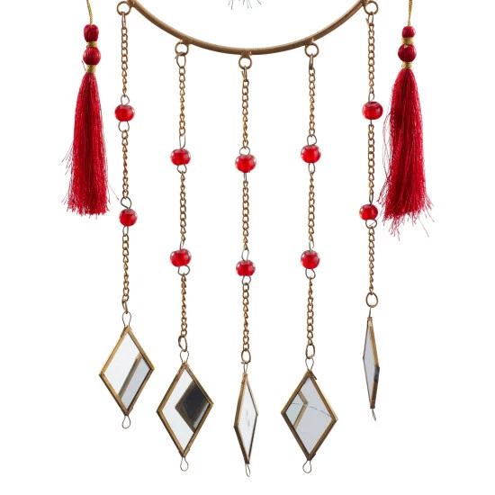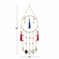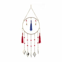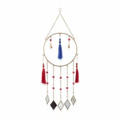 Add a crafty talisman windchime near your bed’s headboards and room windows for a peaceful sleep filled with sweet and supple dreams. A light and delicate piece to create a whimsical atmosphere anywhere in your home. The soothing sound of this windchime will keep you relax and rejuvenated throughout the day. This item is shipped in one carton. Glass mirror is cut and attached to a ring base via chain to form a remarkable windchime design. This windchime features a durable chain hanger for easy hanging via nail or hook. Suitable for indoor and outdoor use. Made in India. Contemporary style.. Crafted in a contemporary style that fits great in most homes. This hanger windchime is made of high quality iron, thread, mirror, and glass beads. This delicate chain windchime features brass bordered mirror chimes, gold cone bells, and red and blue string tails. This dreamcatcher inspired windchime is crafted with diamond shaped mirror chimes with glass bead chain accents, bell cones, and string tails. Each item measures 12″L x 2″W x 31″H and weighs 2 lbs