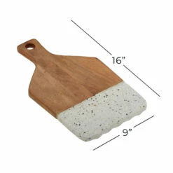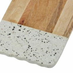 Get both function and fashion with this wood and terrazzo contemporary chopping board. The paddle shape features 75% natural golden brown mango wood with a loop at the end for hanging and drying. The remainder of the cutting board is white terrazzo with gray speckling. Both of these materials are food safe and easy to clean. The elevated contemporary style adds a chic look to your modern kitchen while also making a great serving board for charcuterie, cheeses, and fruits when you entertain!