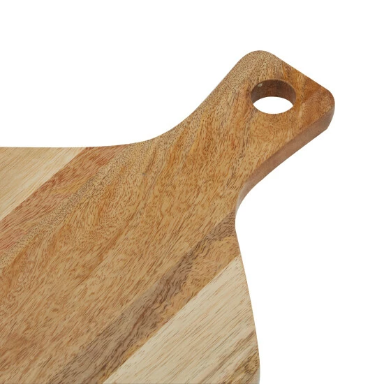 - Paddle cutting board measures 15.75″L x 9″W x 0.65″H and weighs 2.5 lbs.