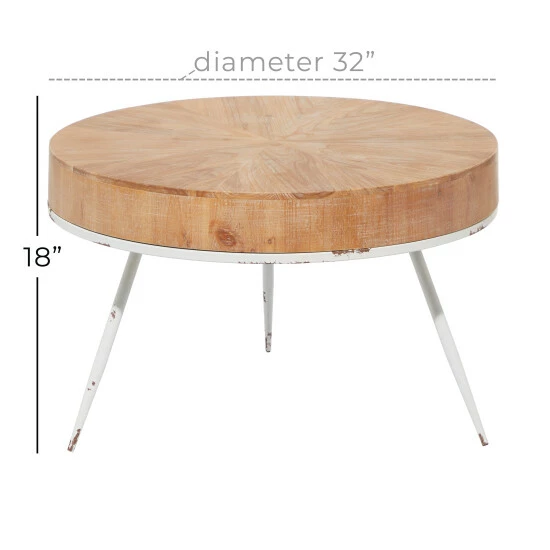 - This modern style inspired design natural wood color round wood and metal coffee table features a unique round table top design made of natural wood fitted to a solid metal tripod frame for stability