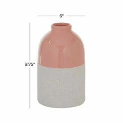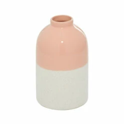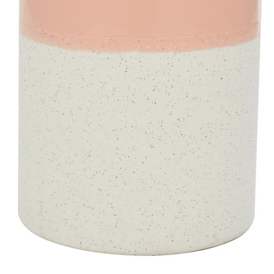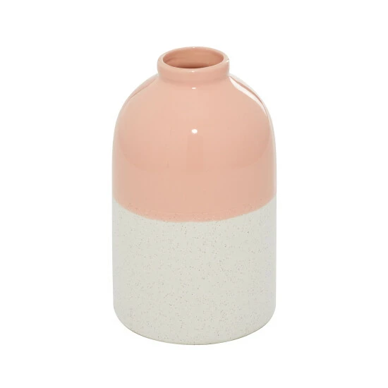 Sweet and modern, this ceramic bottle vase features chic color-blocking, boasting a glossy pink glaze on the top half and a matte gritty white finish beneath. The wide cylinder bottle vase shape features a small opening at the top. The soft finishes should work with most color palettes, and can stand alone or be filled with a stem or two of vase filler for a lovely juxtaposition. This item ships in one carton. Suitable for indoor use only. Cylinder vase with fluted and medium-sized rim opening. Modern Design.