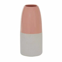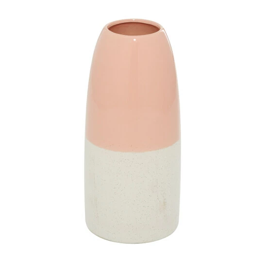 Sweet and modern, this ceramic vase features chic color-blocking, boasting a glossy pink glaze on the top half and a matte gritty white finish beneath. The tall cylinder shape features a top opening with no lip for a clean, modern look. The soft finishes should work with most color palettes, and can stand alone or be filled with a small bundle of vase filler for a lovely juxtaposition!