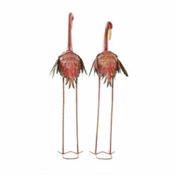 Spice up coastal flowerbeds, gardens, backyards, and lawns with this 2-in-1 iron-made flamingo garden statue set. It features realistic feather shapes and color gradients to catch eyes and complement outdoor garden themes. These pink statues balance on metal U-shaped stands and are 51″ and 54″ in height respectively. Keep them sturdy by staking them into the ground or by placing sandbags or big rocks on their attached bases. Use these colorful decor pieces on your patio or lawn to add a playful and inviting feel to your garden Wipe clean with a dry cloth. Suitable for indoor and outdoor use. The set includes two flamingos. Coastal design. This item comes shipped in one carton.