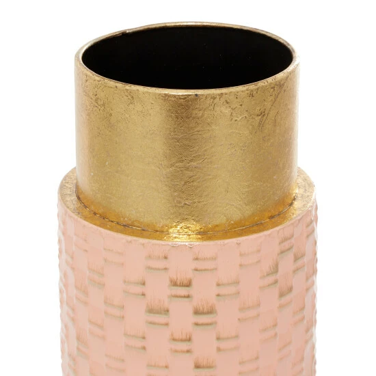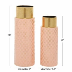 Use as a flower holder on your coffee, console, and kitchen tables, or as a decorative piece on a book shelf or office shelf . Displayed in your dining or living room, entryways or hallways, this vase is sure to bring charm and joy to any space . Display with or without vase filler to add pops of soft color with gilded shine in your entryway or living room console. Lightweight iron is safe for all surfaces. This item ships in one carton. Suitable for indoor use only. Each set comes with 2 vases. Cylinder vases with wide rim openings. Contemporary design.