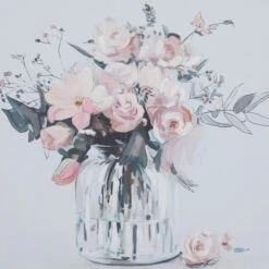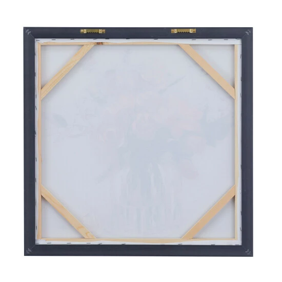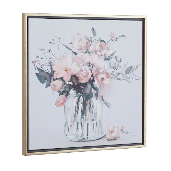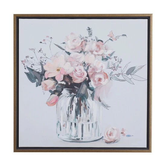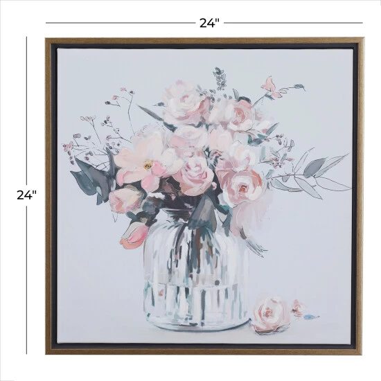 Display this framed flower wall art as a focal point canvas for your stunning living spaces that features light toned walls and pastel toned decor pieces. Bring a finishing touch to your home with an inviting appeal with this console table. Useful and elegant, console tables are more than just a place to throw your mail. This item is shipped in one carton. Due to the handmade nature of this item, no two will be alike, there will be slight differences in shape, size, and color. This item comes with sawtooth hardware at the back for easy hanging via nail or screw. Suitable for indoor use. French Country style.. A French country strikes a balance between rustic & elegant. This tan framed canvas wall art features a glass flower vase with an array of pink, purple, and white flowers. This endearing flower canvas wall art is crafted from polystone, iron, Chinese fir wood, and canvas fabric. This captivating framed flower wall art features a soft-toned flower vase painting with an enchanting long stem floral arrangement. This framed canvas art measures 24″W x 24″H