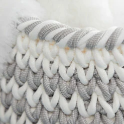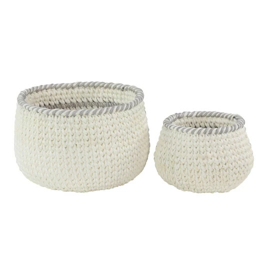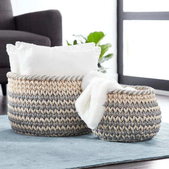 - These fabric storage baskets carry white polyester ropes, some with black mesh wraps creating a grayish/brownish hue