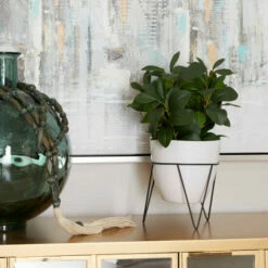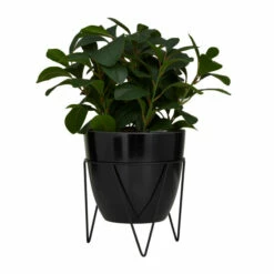 - An artificial plant arrangement featuring realistic round green leaves on a black or white circular ceramic container and black tripod base with hairpin legs