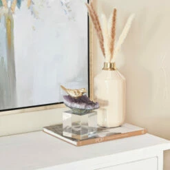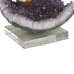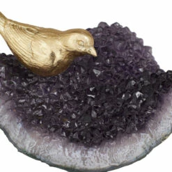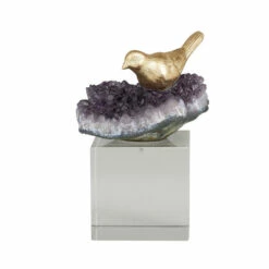 - Table sculpture highlights a metallic gold bird finish with glossy purple fruit in a clear glass base