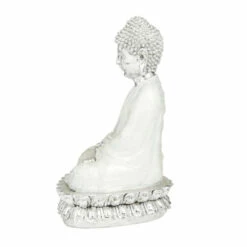 - Meditating Buddha figurine showcases a calming image of a robed Buddha sitting atop two rectangular cushions with charming petal lace details