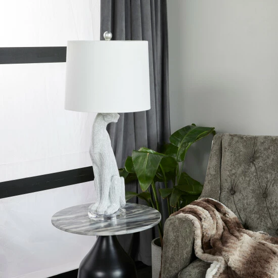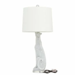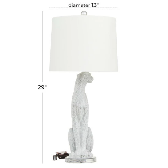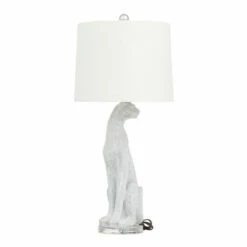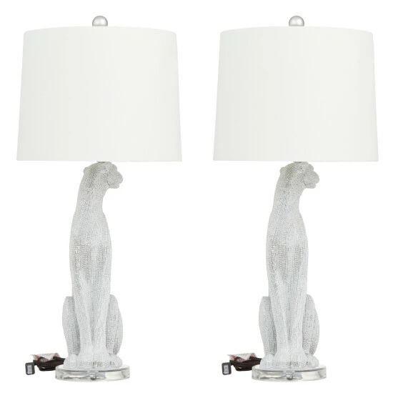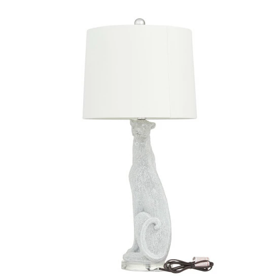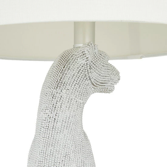A white and gold leopard table lamp that brings charm and elegant look that glows with decorative inspiration to give any room an instant decor upgrade. This eye catching lamp makes a playful addition to your surface space and beautifully illuminate its surrounding area. Make a statement with this unique lamp on mantle, console table or in any living space. Requires 1 Standard Type A bulb, not included. This item comes shipped in one carton. The shade of this table lamp is securely mounted on the leopard-inspired base. Suitable for indoor use only. This accent piece features a linen white drum-shaped lampshade. Set comes with 2 lamps. Comes with an On/Off switch. Glam inspired.