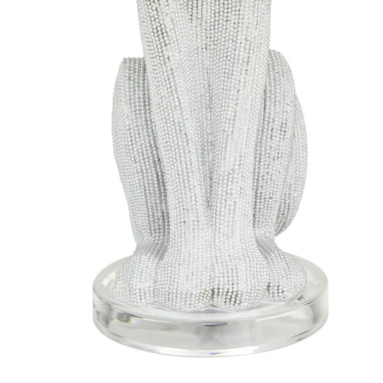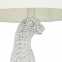 - This decorative table lamp highlights white shade, white and gold leopard body, and smooth transparent base