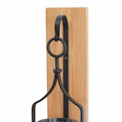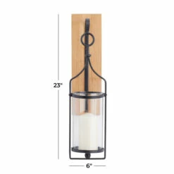 Plug this hanging candle wall sconce into your vanilla or patterned walls for up and down lighting that gives balanced brightness within your home space. Create an excellent focal point on your walls by pairing a wall sconce with some cute accent tables. A creative way to enhance the look of your open wall space. Wall sconce can hold 1 pillar or votive candle. This item comes shipped in one carton. Frame is made with hurricane glass cylinder and metal frame riveted on wood. Easy to hang with 2 back keyhole hooks. Suitable for indoor use only. Farmhouse design.