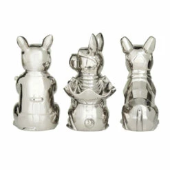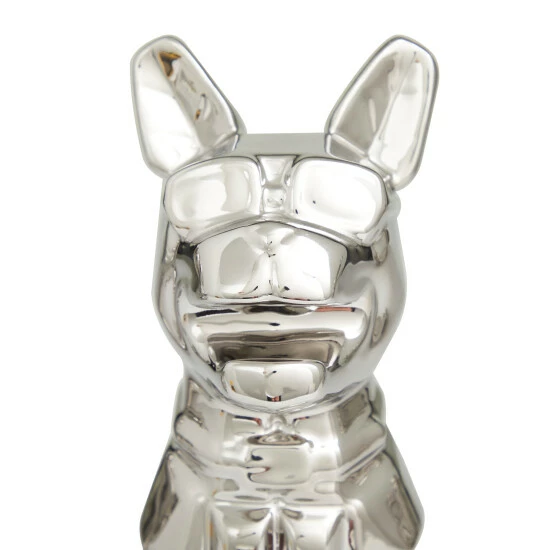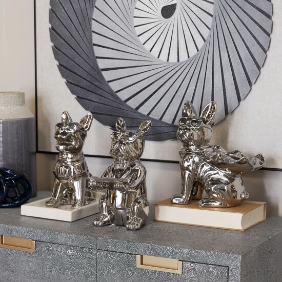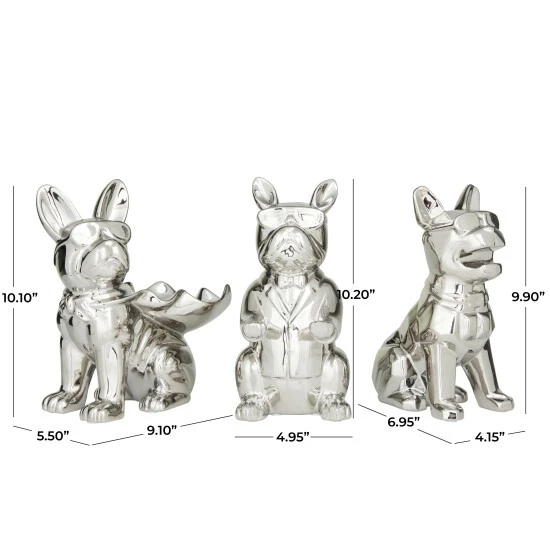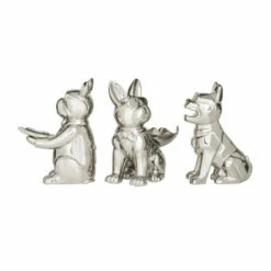 Style your home or office area while having fun with this set of silver dog sculptures that is a great addition to your porcelain collection. Create a balance surface space and added dimensions with this beautifully crafted sculpture. An artistic display to showcase your personality and enhance the look of any open table top space. Items ships in 1 carton. Suitable for indoor use. A set that comes with 3 dog sculptures. Modern style.