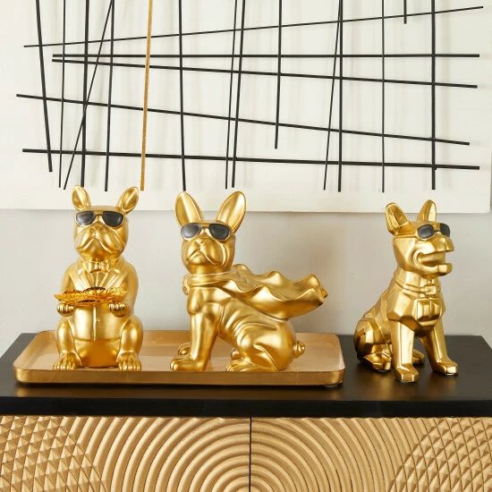 - This set of silver or gold porcelain sculptures featuring dog figurines in a sitting position with intricate facial and body characteristics along with different comical costumes