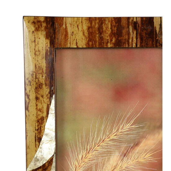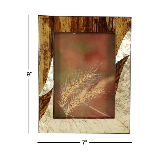Highlight your most treasured memories or small art prints with this unique 7″ x 9″ multidimensional gold capiz shell & banana wood picture frame. Handmade with Upas, a Filipino term referring to the mature, dried outer bark of the banana tree, this wood frame is constructed with carefully selected Upas fibers that are inlaid along with iridescent capiz shells, then resin laminated for a smooth, polished look. This eclectic decor frame features a soft velvety backing with easy open arms and an easel back arm to display horizontally or vertically. The contrasting colors and textures make this a beautifully sophisticated and dimensional rectangular photo frame for your rustic style and eclectic decorโฆ
