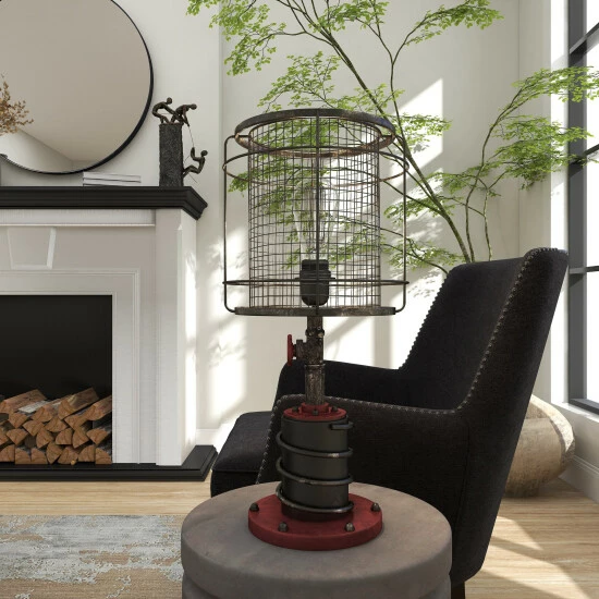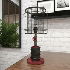 This red and black metal accent lamp is the epitome of industrial style. Featuring a metal mesh wire cage lamp shade with circular bars, a warm Edison bulb with cool zigzag filament, and a distressed red industrial gate valve and exposed hardware base, this black lamp makes a bold statement in your home or office. The easy on/off switch is conveniently coated on the black cord. Perfect size as a table lamp or desk lamp, this accent decor brings warm, ambient lighting to any space needing some bold, industrial edge. Designed with black rubber stoppers at the base that prevent scratching furniture and table tops, as well as sliding around. Uses one standard or Edison 60-watt bulb. This item has a 65″ cord length. Suitable for indoor use only. A novelty cage shade made of metal. Black cord with on/off flip switch. This item comes shipped in one carton. This items comes as a set of 2.