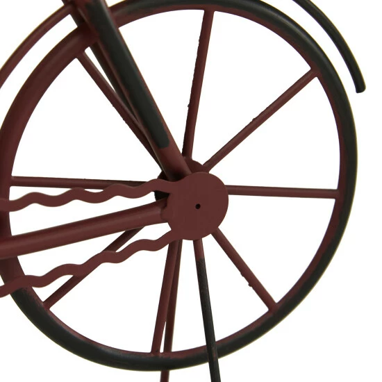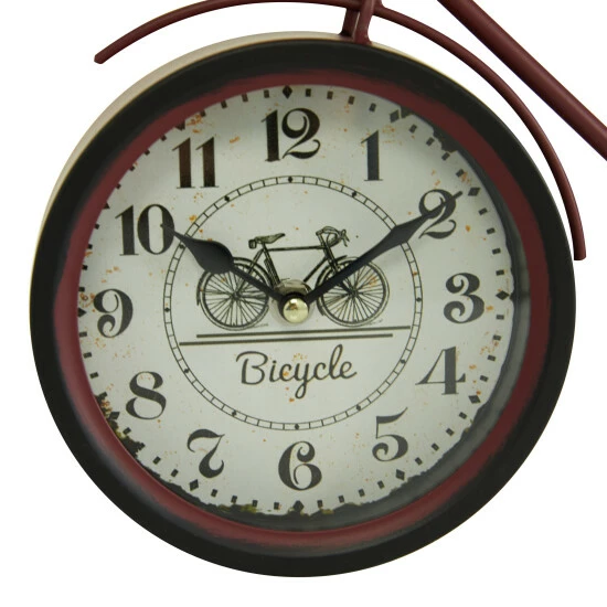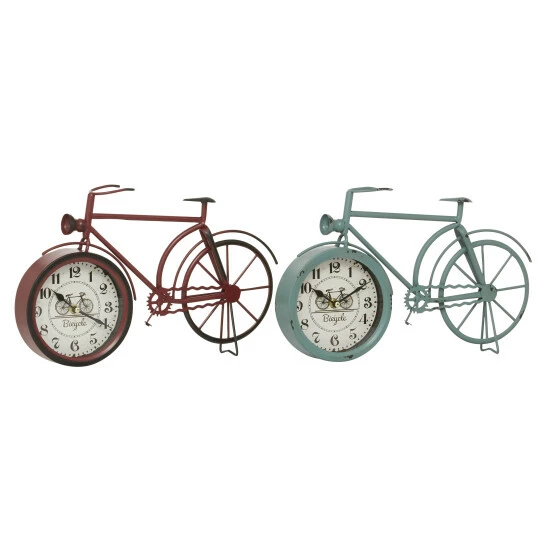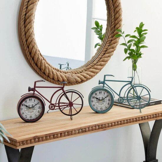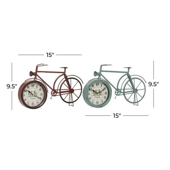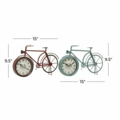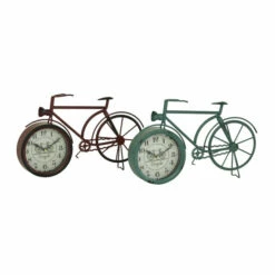 Add some playful element in your country cottage home with these bicycle table clocks in your living room and bed room for an energizing, and punctual vibe everywhere you go. Displayed together or separately to unify your room’s look, this duo of metal bicycle table clocks will have you keeping track of time in style! Each bike sculpture has a large front wheel housing a round analog clock with a bicycle illustration and elegant script in the center. Requires 1 AA batteries. Not Included. This item comes shipped in 1 carton. Features Arabic numerals for the hour and minute markers. The clock mechanism runs silent. Suitable for indoor use only. This set includes 2 clock. Clock face with text “Bicycle”. Country Cottage vibe.