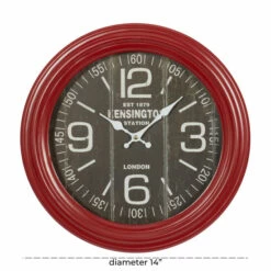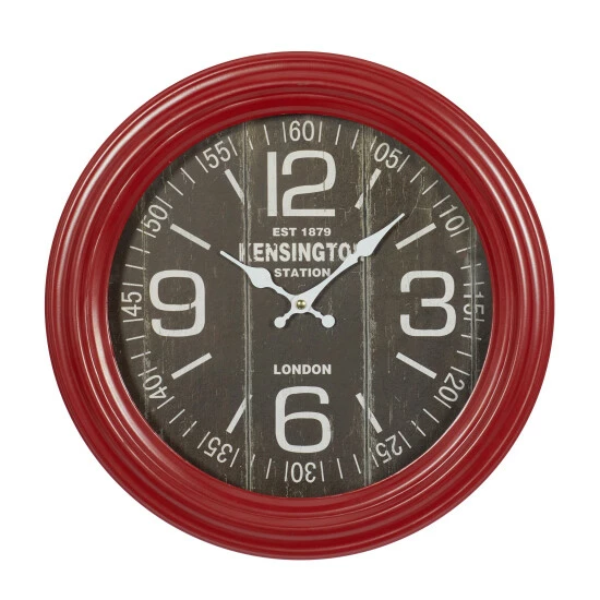 Don’t settle for a basic wall clock to keep you on time. Add this wall clock to your space and create a blend of amazing farmhouse design. Features a red beveled frame, black clock face, white spade hands, and easy-to-read white numerals. Comes in red, black, and white finishes that add charm to your wall. Runs on 1 AA battery. This item ships in one carton. Features Arabic numerals for the hour and minute markers. The clock mechanism runs silent. Item comes with a hardware in the back for easy and secure hang. Suitable for indoor use only. Showcases “EST 1879”, “Kensington Station”, and “London” typographies. Farmhouse-themed style.