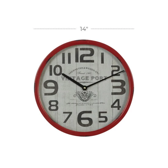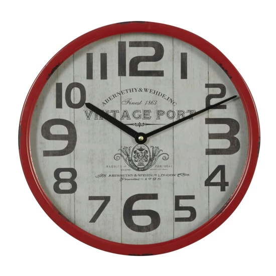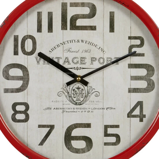 Add a pop of color with vintage charm into your space with this round metal wall clock, featuring elegant script accents. The round metal frame has a distressed red chipped finish for an antique style, housing the faux wood interior clock face with extra large, easy-to-read numbers. The center has elegant cursive and serif block script reading “ABERNATHY & WEHDE INC, Finest 1863, VINTAGE PORT” with scrollwork, as well as a crest with “PRODUCT OF PORTUGAL” and another Abernathy signature. Although this wall clock looks antique, it is lightweight, easy and ready to hang, and reliably runs on one AA battery.