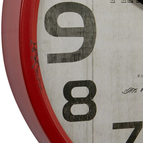 - Distressed brick red finish over housing, light gray clock face with black lettering and numerals