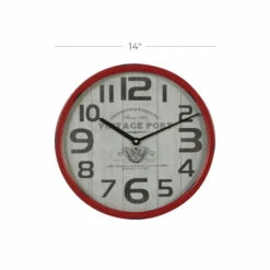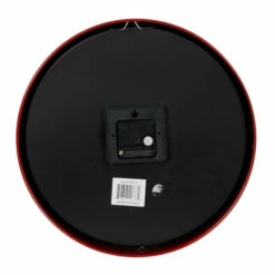 - Round red wall clock measures 14″L x 2″W x 14″H and weighs 3 lbs.