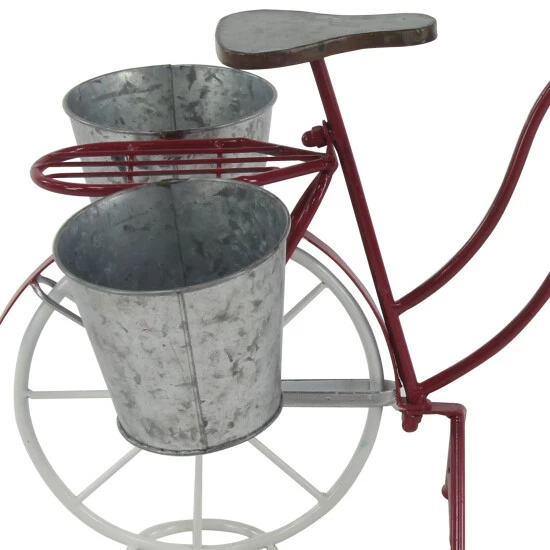 This metallic bicycle-inspired planter brings tranquility to your space by allowing you to fill it with plants—hence it promotes wellness and creates an immediate feeling of relaxation. This decorative planter is sure to add bundles of charm to your home. Beautifully detailed, it features three bucket-style pots in gray finish. This planter is made out of tin with solid construction, offering durability and stability. Jazz up vintage themed spaces using this charming accent piece that is ideal for outdoor use. This unique planter brings style and tranquility to your space by allowing you to fill it with plants, hence it promotes wellness and creates an immediate feeling of relaxation Wipe clean with a dry cloth. A decorative planter that provides spacious planting space. Suitable for indoor and outdoor use This item doesn’t have drainage holes Vintage inspired. This item comes shipped in one carton.