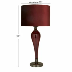 Illuminate your living room or bedroom corner with this accent table lamp to bring together the glam theme of your indoor aesthetics. Display it on top of a console dresser or a low-lying side table with decorative orbs, hardbound books or magazines for a balanced look. This eye catching lamp makes a playful addition to your surface space and beautifully illuminate its surrounding area. Designed with black rubber stoppers at the base that prevent scratching furniture and table tops, as well as sliding around. Furnished with a socket for one medium-sized E26 bulb. This item comes shipped in one carton. Suitable for indoor use only. Features a drum velvet lamp shade. Comes with a toggle on/off switch. Glam design.. Elevate your surface space and add a touch of luxury with this glam inspired piece. This home decor is crafted with velvet fabric shade and glass base for a chic and solid form. This table lamp highlights a dark red shade and glass body. Dark tempered glass in tapered style flaunts this table lamp that compliments its velvet red shade. This item measures 13″L x 13″W x 27″H and weighs 4 lbs
