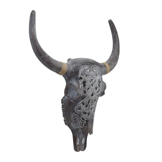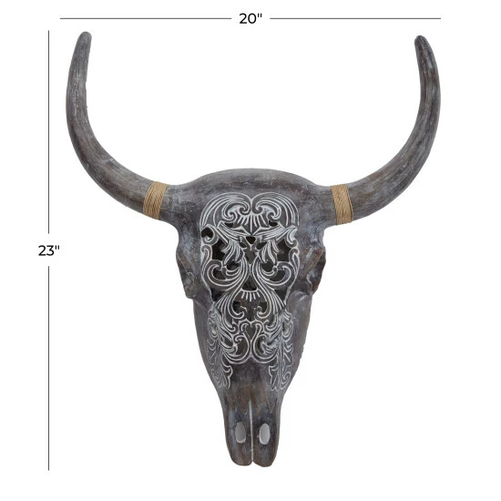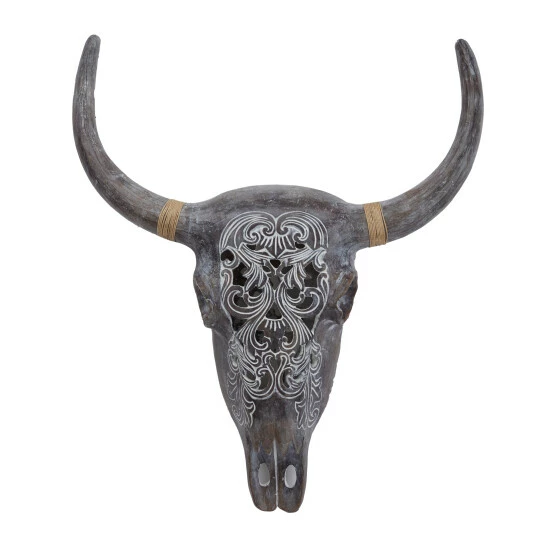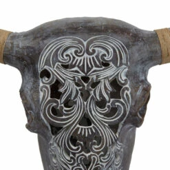- Ornate scrollwork carved out details complemented with its print patterns add mystery and character to this animal skull decor