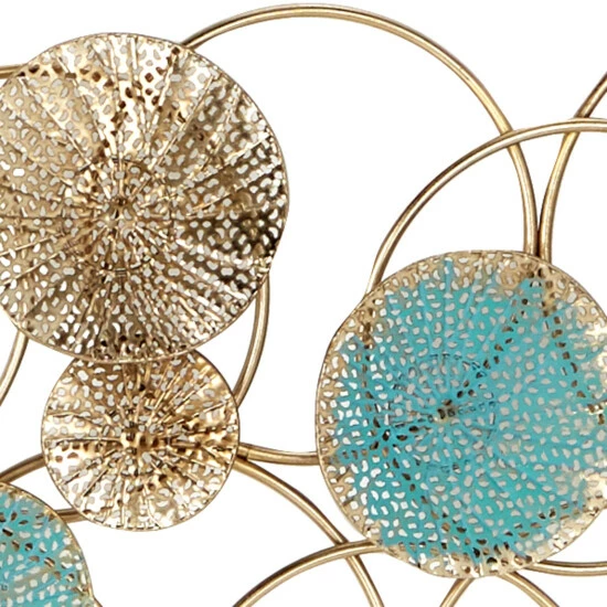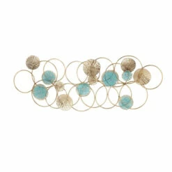 Let your glam, modern, and eclectic-inspired home interior styles radiate a light, sweet, and charming aura all-around the house with this chic and stylish abstract-style ‘Golden Hoops and Discs’ iron wall art! This stunning home decor showcases a collection of round iron hoops in a polished gold finish and thirteen various sized iron discs in rose gold and chalk blue textured finish. They come with an easy-to-hang feature and are ideal wall decorations for hallways, the living room, the kitchen, and the master bedroom. Suitable for indoor use only. Contemporary theme. This item comes shipped in one carton.. The best accessory for a wide array of home designs, especially contemporary.. This disc wall art decor is crafted with solid iron material. This disc wall decor features metallic gold finish with sapphire blue accent finish over perforated details. Designed with thirteen various-sized iron discs in rose gold and chalk blue textured finish. Abstract gold wall art measures 48″ in length, 2″ in width, 16″ in height and weighs 1.2 lbs.