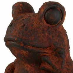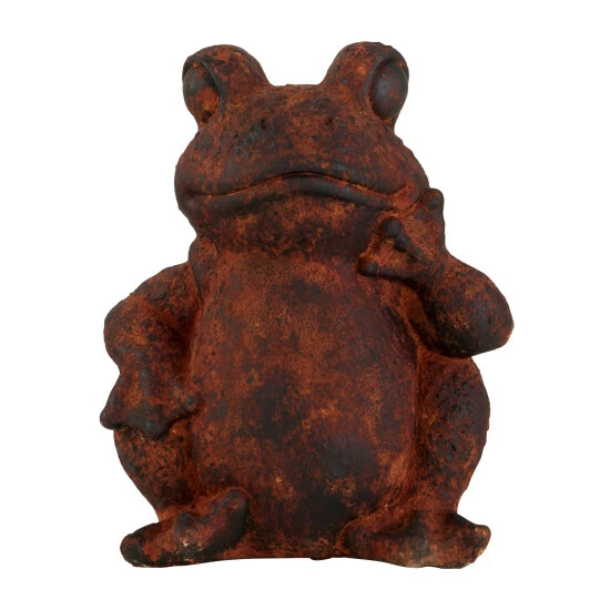 Create whimsy and wonder with this outdoor frog statue. This frog decor made from weather-resistant polystone has delicate features and a rusted brown and black finish. The vintage look of this frog decor makes it a whimsical piece in gardens and patios, creating a playful look in rustic-themed homes. This frog statue is an excellent accent in gardens and patios of rustic-style homes Wipe clean with a dry cloth. Suitable for indoor and outdoor use. Rustic design. This item comes shipped in one carton.
