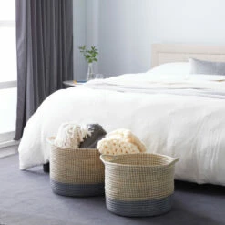 Time to go all natural with these set of seagrass baskets, perfect for home organization needs. This set of three baskets are made from hand-woven seagrass from Vietnam. Clever as it is stylish, these baskets are made from sustainably harvested water hyacinth and woven braided fiber, creating non-collapsible and robust bodies. The traditional yet stylish brown and white frames complement contemporary or modern themed homes. This item comes shipped in one carton. Suitable for indoor use only. Made in Vietnam. Set of 2 brown and white seagrass baskets. Contemporary design.