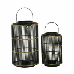 Use this candle lantern decor set to create a sleek, eye-catching display on your mantel, coffee table, or end table. Delight your guests and make any occasion extra special by adding a lighted or flameless candle to this lantern. Made with a sturdy base, it is perfect for creating an elegant atmosphere at your table top or mantel. This metal candle lantern set will hold two pillar candles. This item comes shipped in one carton. Hang by handle or place on a mantel or table. Suitable for indoor use. Made in India. This set includes two candle lanterns. Contemporary design.