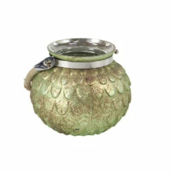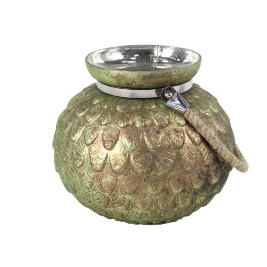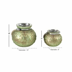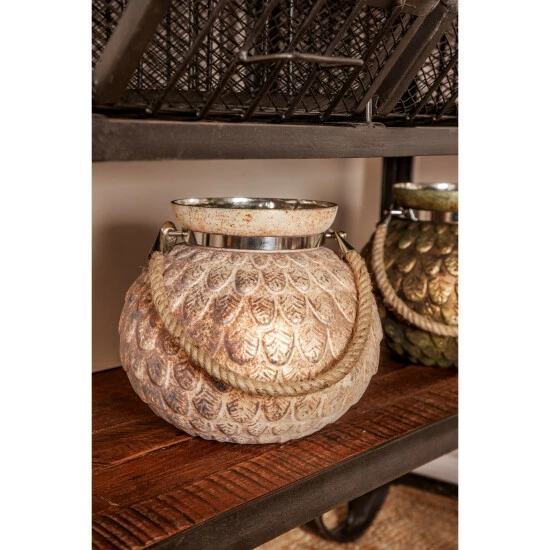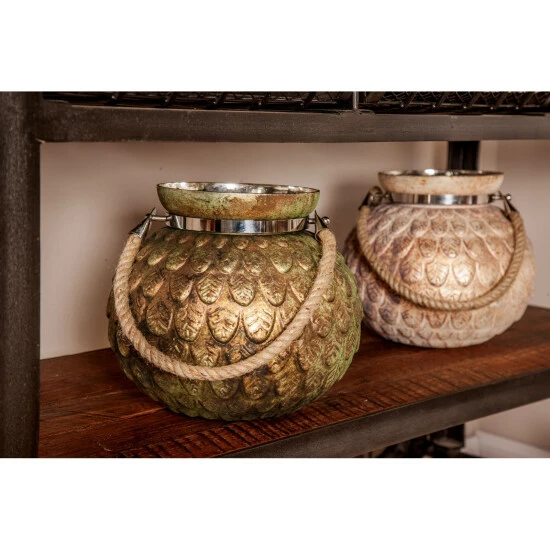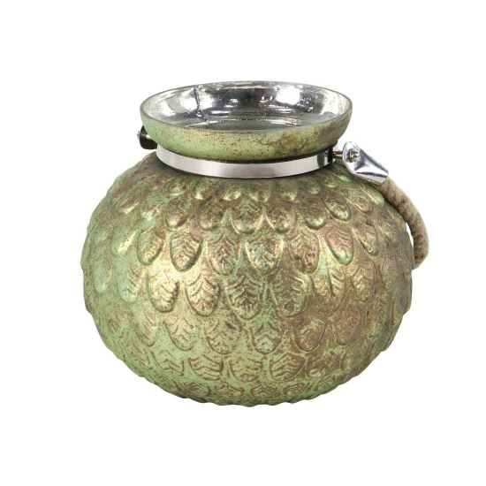 Add an eye-catching accent to your home ensemble with these stunning candle lanterns from Studio 350. Each piece features a round-shaped body frame crafted from glass, designed with leaf-inspired patterns, a stainless steel neck brace and a jute rope handle. Donning a shimmering light green finish with gold highlights, these candle lanterns are sure to radiate a touch of glamour to any room or space. Fill them with your favorite candle, twinkle lights, or other decorative items to create an artful statement.