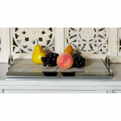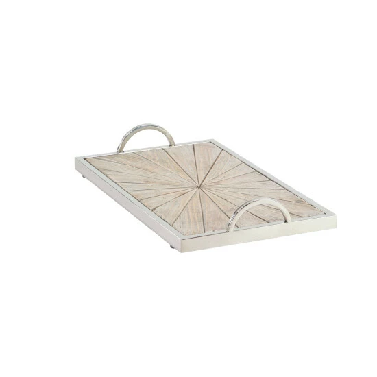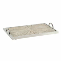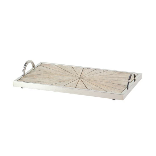 Accentuate your tabletop with these elegant rectangular trays. This set features two contemporary metal and wooden trays with radial line patterns, gray-finished rims and a distressed look. Each tray also has silver steel handles on the sides, which makes it easy to hold. Crafted from quality and durable pinewood materials, these trays can be used for decoration, organizing stuff as well as serving food and drinks.