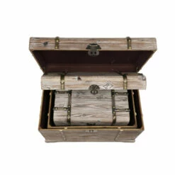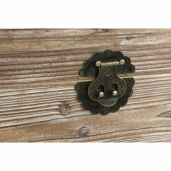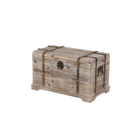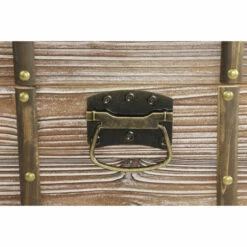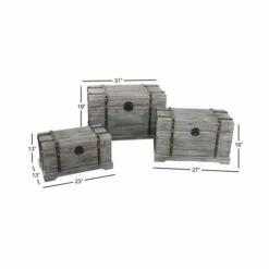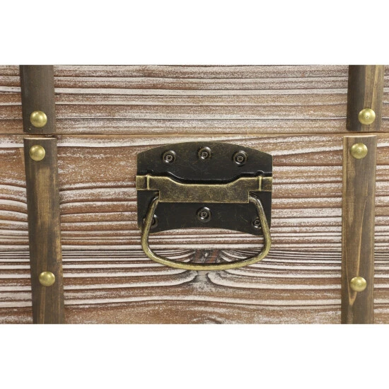Beautiful, rustic decorative chests crafted from Chinese fir wood and finished with an antique whitewash. The neutral mocha brown tone of these wood trunks allows for seamless integration into any color palette while emanating rich texture and design from the whitewashed finish, highlighting the rustic natural wood grain entail. Decorative engraved metal rosette latches on each chest add a vintage style touch, along with brass bail pull handles on the sides and brass studs along the wood bars. Set of 3 sizes offers ample home storage.