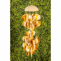 Calm your mind and breathe into the ocean breeze as you take a break from your daily life and marvel at the beauty of Mother Nature and her gracious bountifulness. Let the sound of wind be magnified as they drift into your home’s entryway and tall wooden windows with this coastal-inspired, coconut windchime! This elegant home decor showcases a half-shaped coconut shell windchime base and smaller round coconut shells attached to its cream-finished strings in a textured cream white and silver finish. They are ideal home decorations for entryways, living rooms, balconies, outdoor gardens, and backyard patios. This item comes shipped in one carton. Item comes with hanging strings for easy and secure mounting. Suitable for indoor use. Made in Indonesia. Coastal design.
