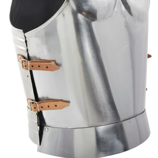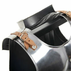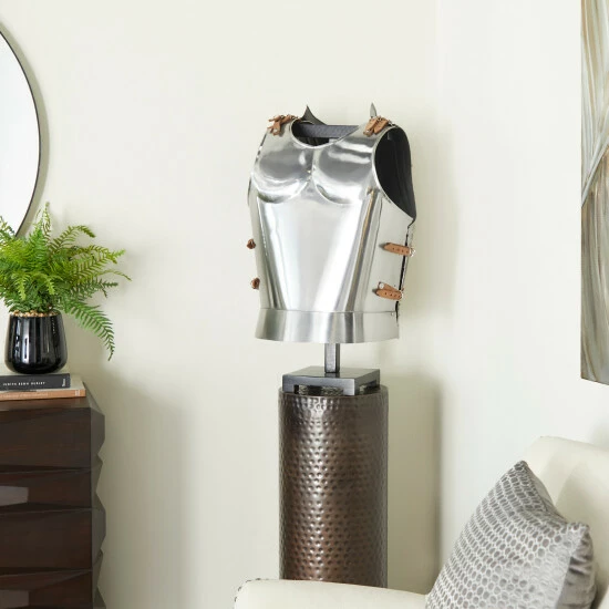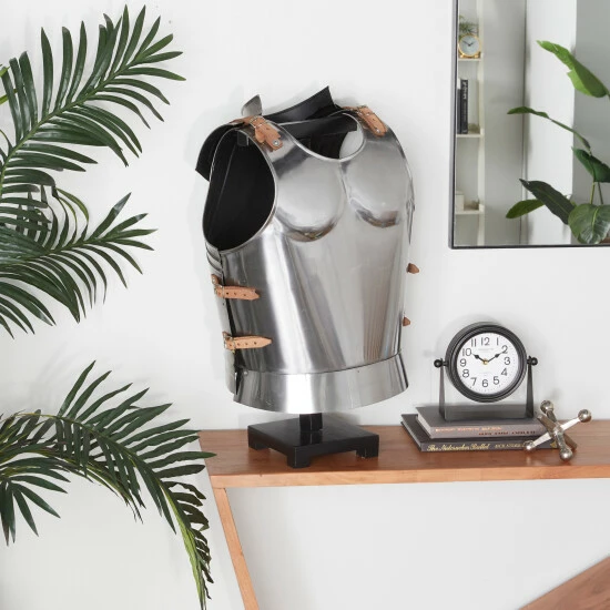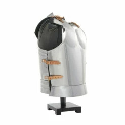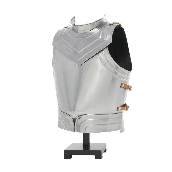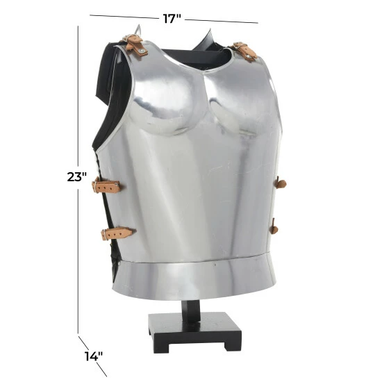Add an artistic display to your interior with this vintage style armor replica with historically accurate and authentic design. A sturdy and long lasting construction that for a long lasting display. Give your surface space a museum inspired appeal with this beautifully crafted armor. This item comes shipped in one carton. Suitable for indoor use only. Made in India. Vintage Theme.. The vintage design of this home decor brings a sense of the past to your home. This chest armor with stand is crafted of solid and quality metal material. This metal muscle chest armor replica features a metallic silver finish with brown accents. A unique decorative accent piece for home featuring an awe-inspiring silver chest armor replica furnished with brown leather details and a black square stand. This item measures 17″L x 14″W x 23″H and weighs 14 lbs