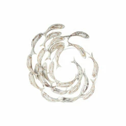 Add whimsical, dynamic movement to your coastal styled home with this spiraling white wooden fish wall decor, made from hand-carved Albasia wood. The textural, naturally white-colored bark of the repurposed wood is handmade into wood fish with deep groves detailing their bodies. Each fish is secured to the radial white iron frame in a staggered pattern by small iron bars to create dynamic, fluid movement. Sturdy & dimensional, this fish wall decor protrudes 4″ from the wall, allowing a shadow to cast behind it, adding even more dimension to the circular movement of the beautifully hand-carved fish. Due to the handmade nature of this item, no two will be alike, there will be slight differences in shape, size, and color. Safe and easy to hang from its metal loops in the strong iron frame. Suitable for indoor use only. This item comes shipped in one carton.