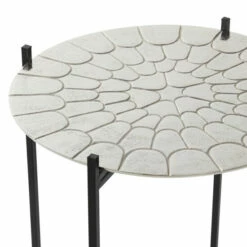 - This round metal accent table has a silver surface and black frame that fits a contemporary aesthetic