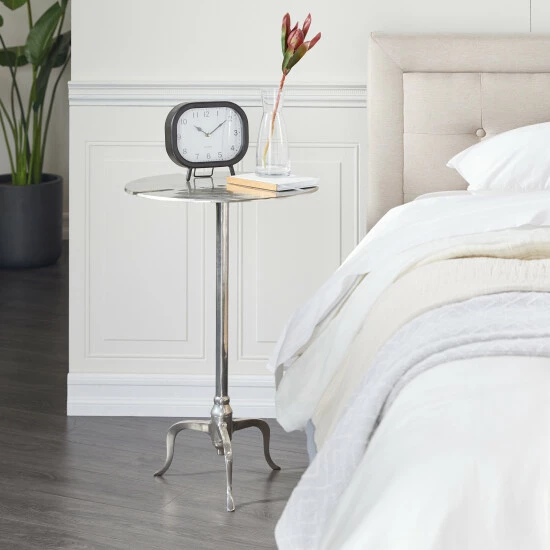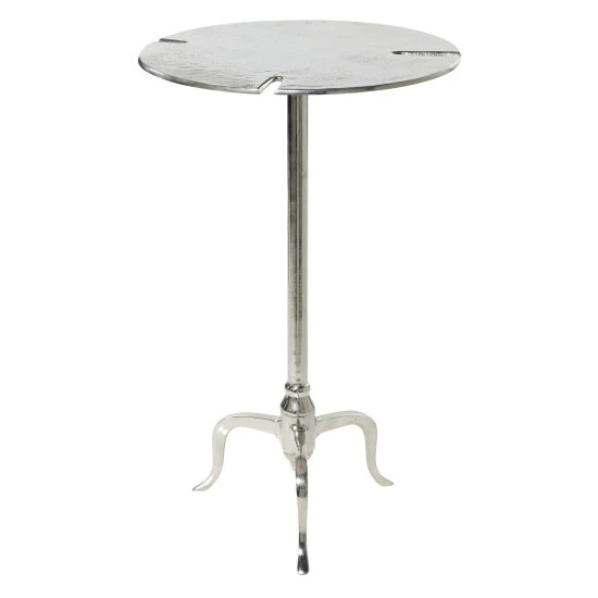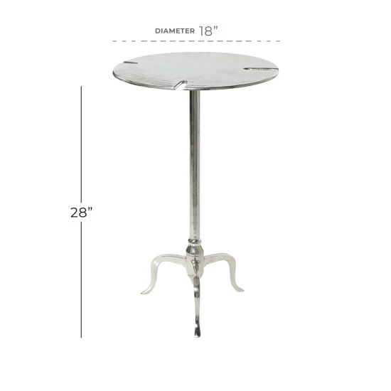 - This round silver accent table features a reflective finish, tripod legs, and flat surface for holding decor