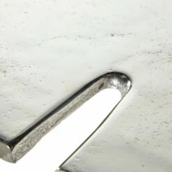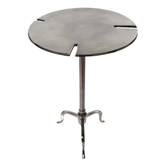 - The round metal accent table has a striking polished silver finish