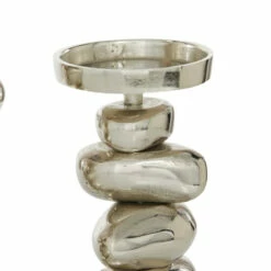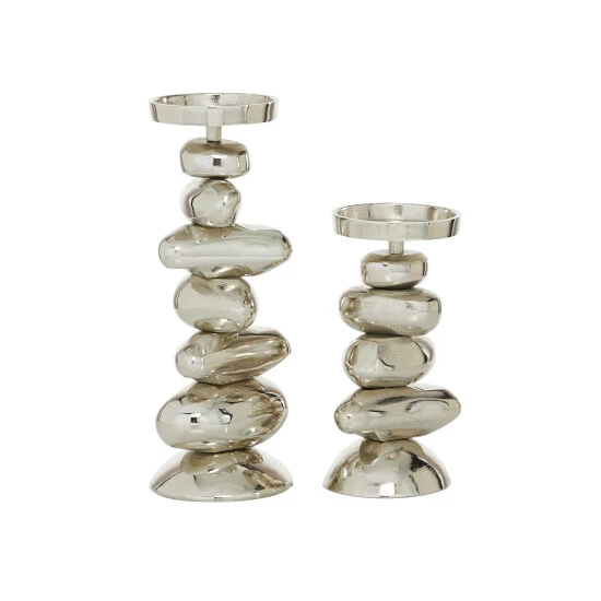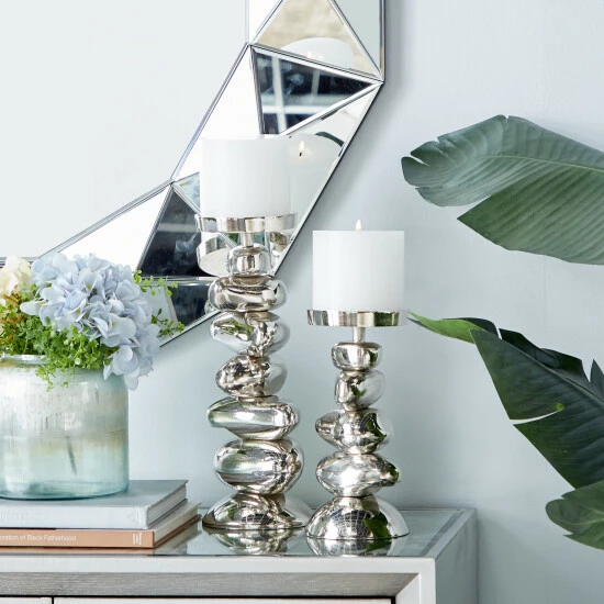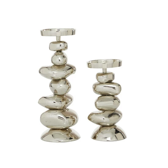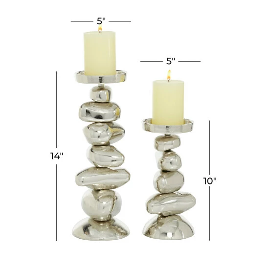 Place this aluminum candle holder set on in your modern-style entryway or living room. Delight your guests and make any occasion extra special by adding a lighted or flameless candle to this candle holder centerpiece. Made with a sturdy base, it is perfect for creating an elegant atmosphere at your table top or mantel. This decorative candle holder set will hold two pillar candles. This item comes shipped in one carton. Suitable for indoor use. Made in India. This is a two-piece candle holder set from India. Contemporary design.