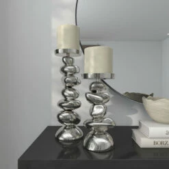 - This metal candle holder set has a reflective silver design