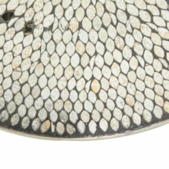 This sturdy accent table carries a beautiful mosaic top with semi raised edge to ensure your items will stay put. Use it as an accent piece in the living room, library, bedroom, waiting areas, or hallways of you home. A compact friendly table providing you with additional storage space any where in your home. This item comes shipped in one carton. Suitable for indoor use only. Made in India. Glam inspired. Maximum weight limit is 100 lbs