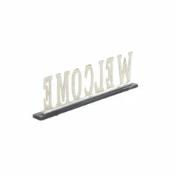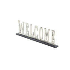 This welcome sign dรฉcor will induce a much more chill atmosphere when displayed on tables od shelves in your glam style living space. Let these accent pieces provide a sense of style to your home by displaying them on top of a shelf, countertop, mantel, or an accent table. This home dรฉcor is perfect for creating a focal point over your accent table, countertop, shelf, or mantel. Designed with black rubber stoppers at the base that prevent scratching furniture and table tops, as well as sliding around. This item comes shipped in one carton. Suitable for indoor use only. Made in India. Standing WELCOME sign. Glam theme.