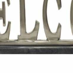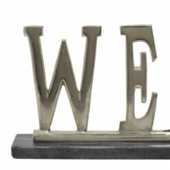 - This glam style inspired design silver aluminum welcome sign dรฉcor features the word “WELCOME” in bold typography attached to a rectangular stand with a premium metallic touch
