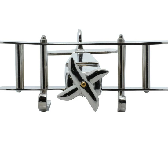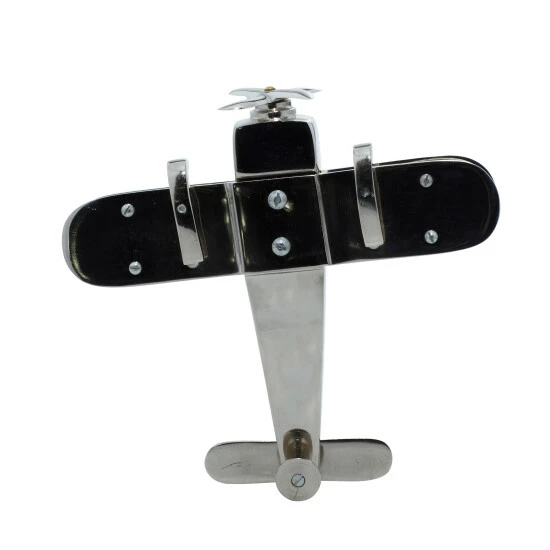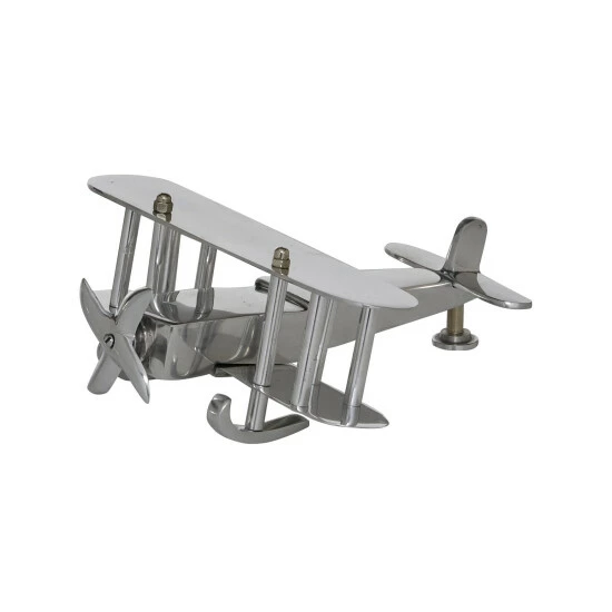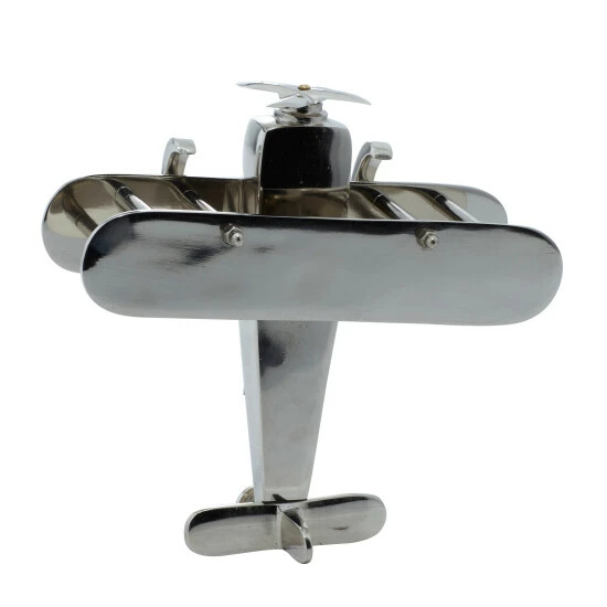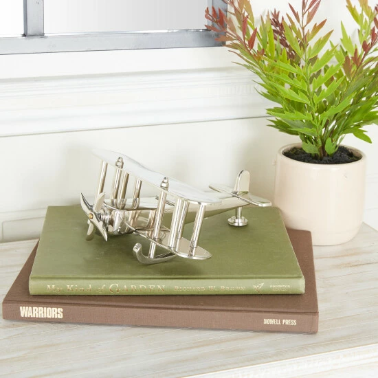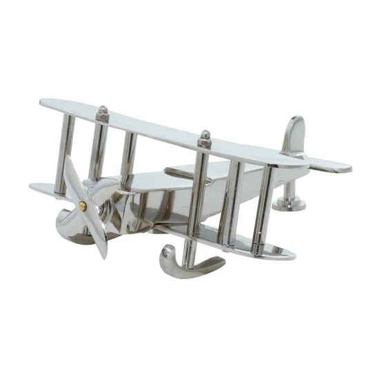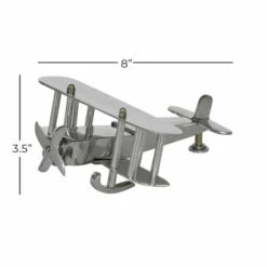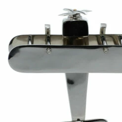 This high-shine metallic silver metal prop plane makes an excellent gift for loved ones who are pilots, model plane collectors, or aviation enthusiasts! This metal plane is crafted from lightweight yet durable aluminum with a polished finish. The plane’s details reflect a seaplane with float bases, so may also be a floatplane. The minimalist details keep an elevated modern style while still exhibiting the silhouette of a classic seaplane. This stylish plane decor is the perfect size for your home or office tabletops or shelves. This item is shipped in one carton. Suitable for indoor use only. Crafted in India. Modern Design. Aluminum sculpture makes a great gift for any occasion.