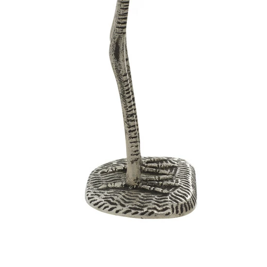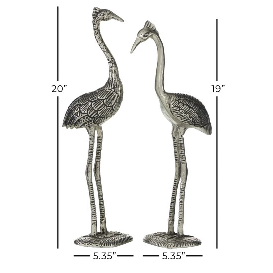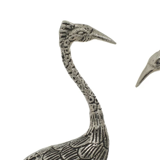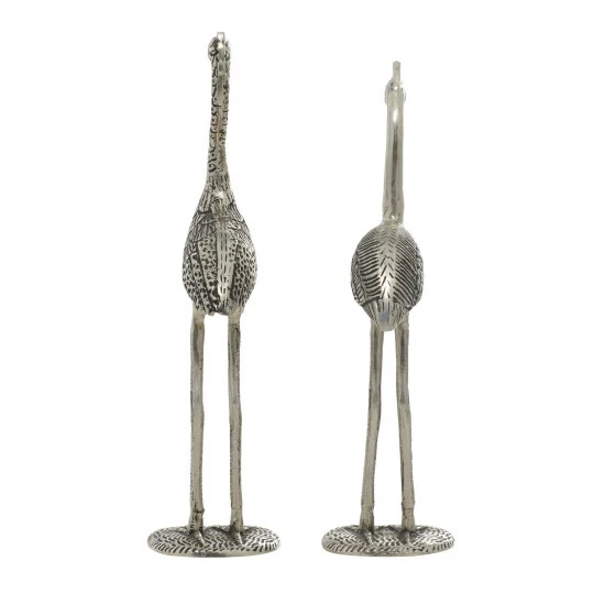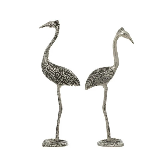 Coastal to Eclectic, this pair of silver aluminum flamingos brings a fun feel with a touch of rustic style to any space. The metal sculptures feature intricate carvings to form the faces, feathers, legs, and textural bases of this bird decor. Both birds are poised upright, one slightly taller than the other. The black between the carved metal adds a slightly vintage look. Animated look placed on a realistic figurine silhouette allows for freestyle garden styling. Designed with stoppers at the base that prevent scratching furniture and table tops, as well as sliding around. Wipe clean with a dry cloth. Suitable for indoor use only. Made in India. A set of 2 aluminum flamingoes with a muted silver finish. Rustic design. This item comes shipped in one carton.